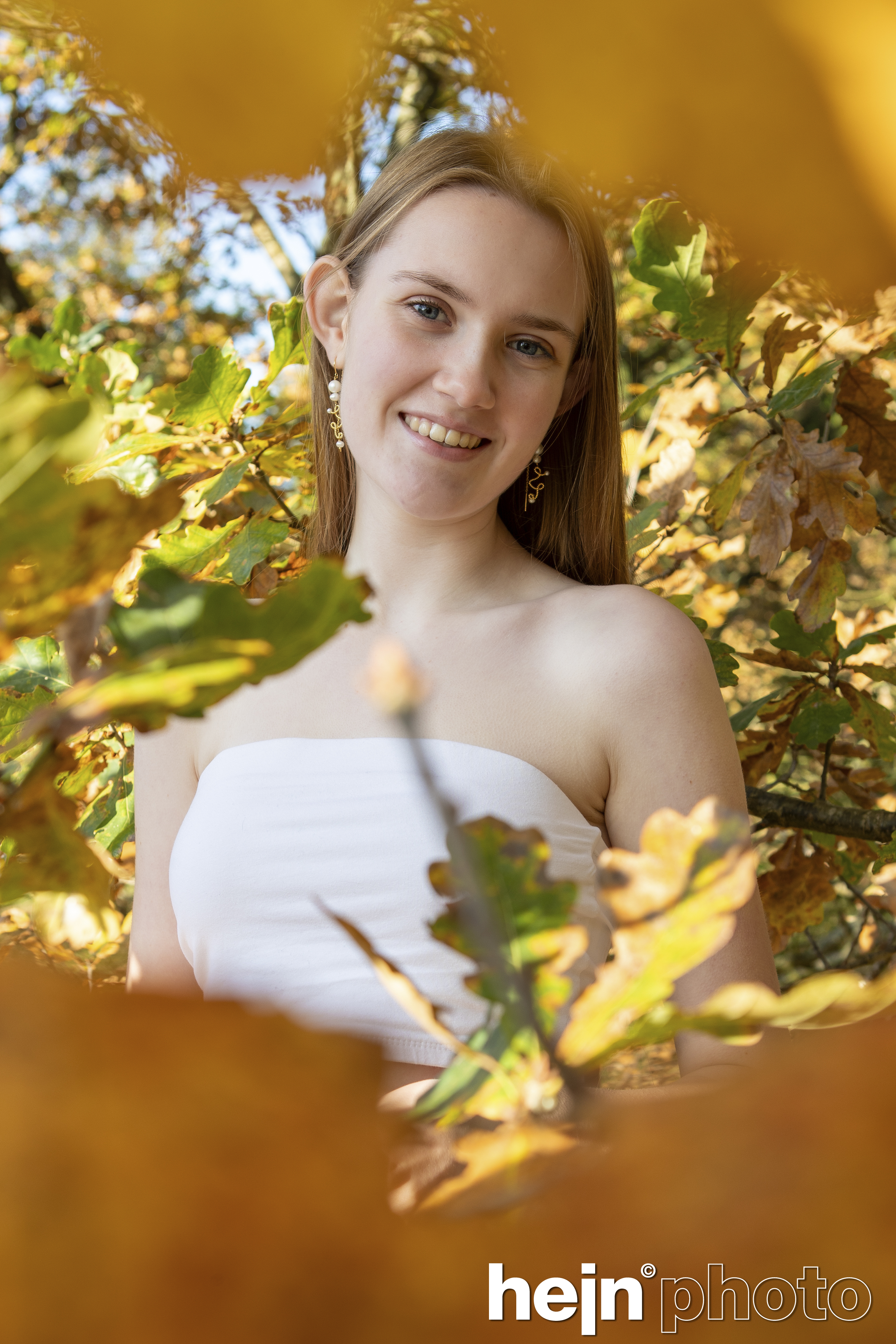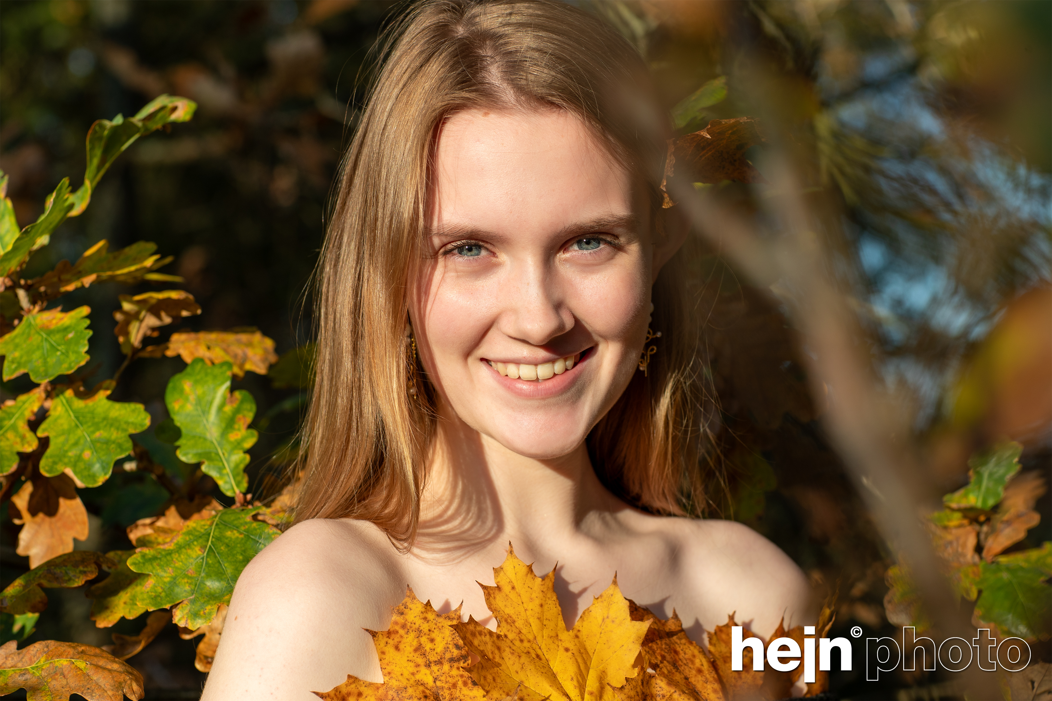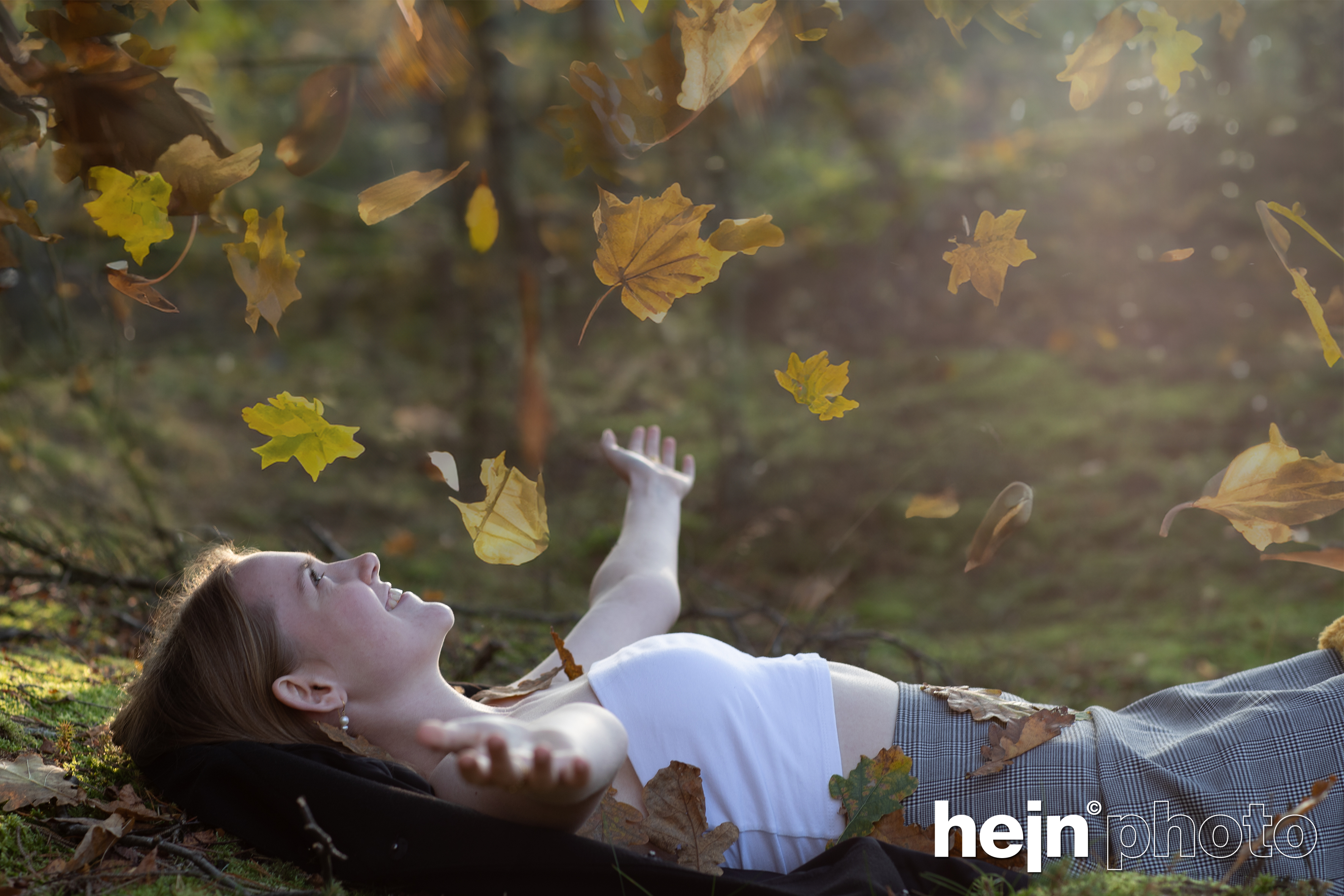 The scene captures the peaceful yet enchanting atmosphere of nature, with the model gracefully interacting with the leaves as they drift around her, evoking a sense of tranquility and the fleeting beauty of the season.