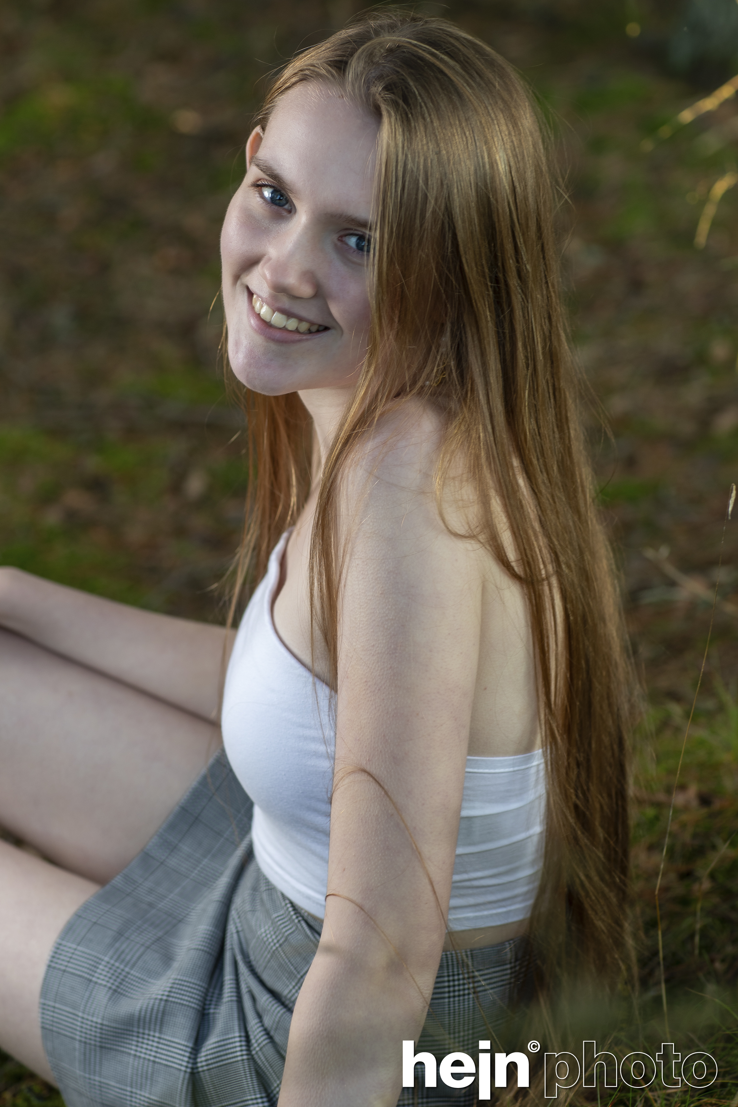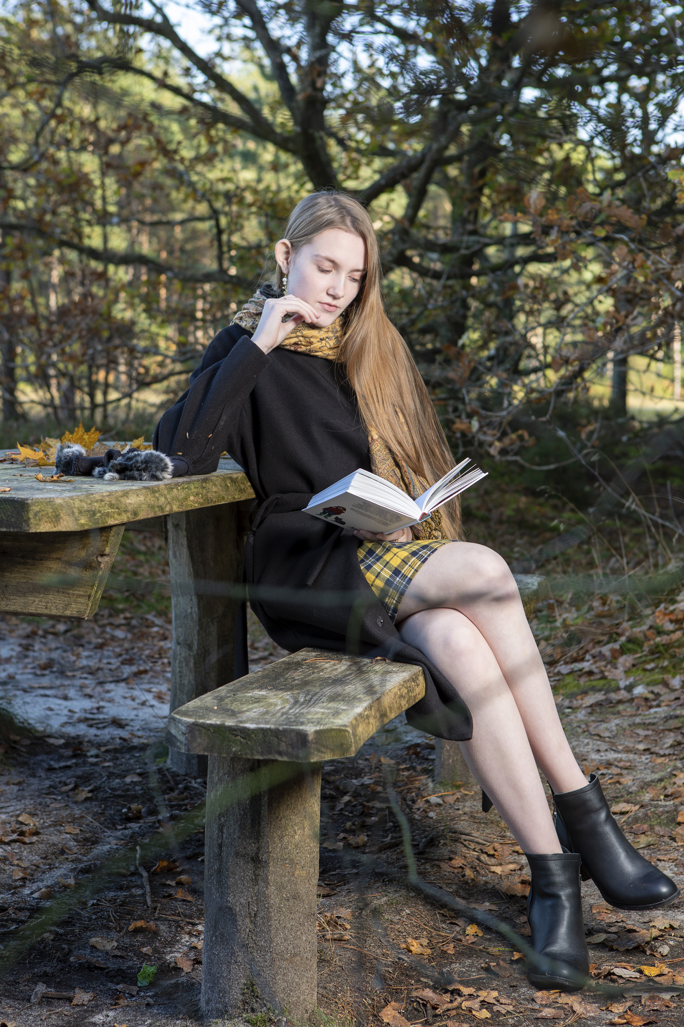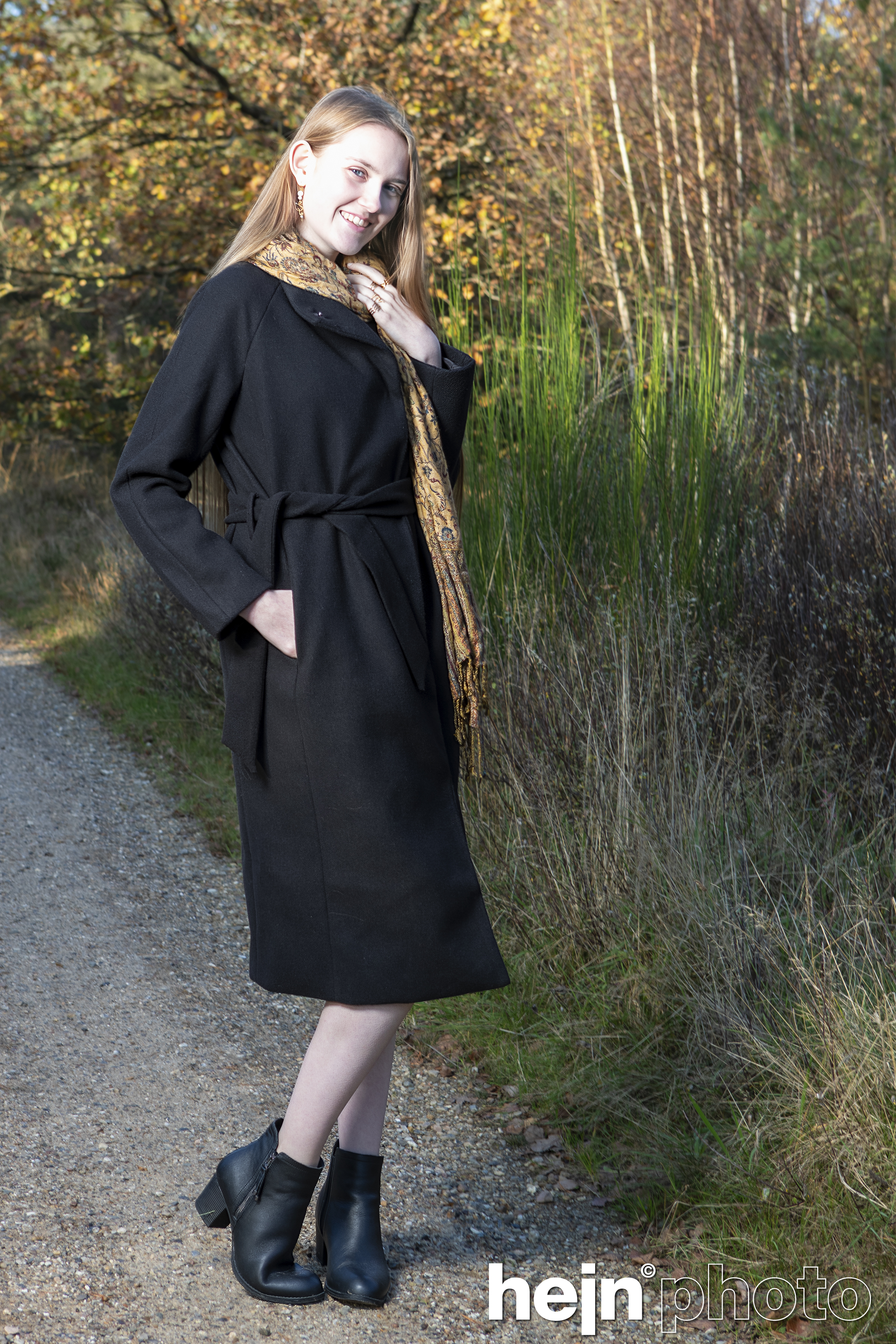 The scene captures the peaceful yet enchanting atmosphere of nature, with the model gracefully interacting with the leaves as they drift around her, evoking a sense of tranquility and the fleeting beauty of the season.